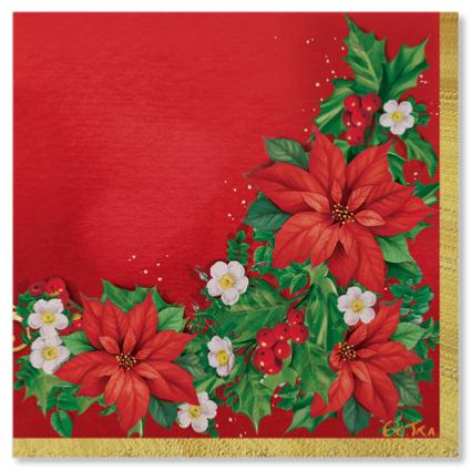 Tovagliolo in pura cellulosa 3 veli, 33 x 33 cm, Made in Italy, fondo rosso e decoro natalizio.