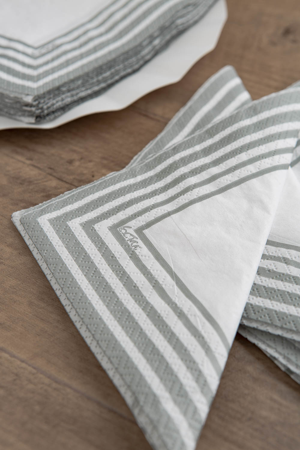 Tovagliolo in pura cellulosa compostabile 2 veli,33 x 33 cm, Made in EU, fondo bianco e righe colore grigio, Certificato OK COMPOST- TUV.