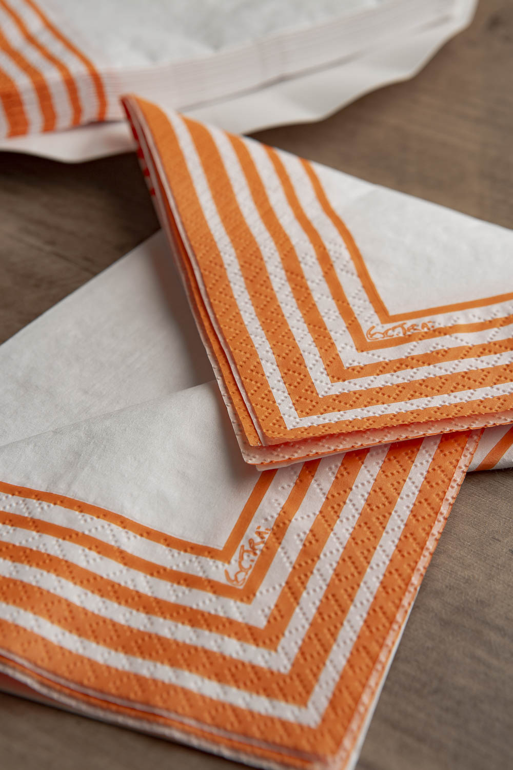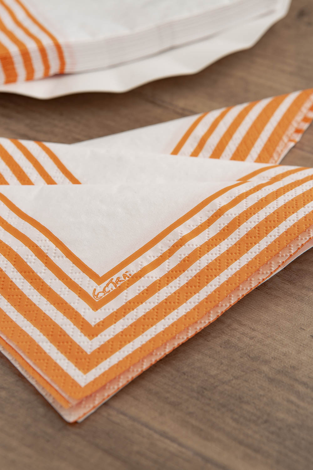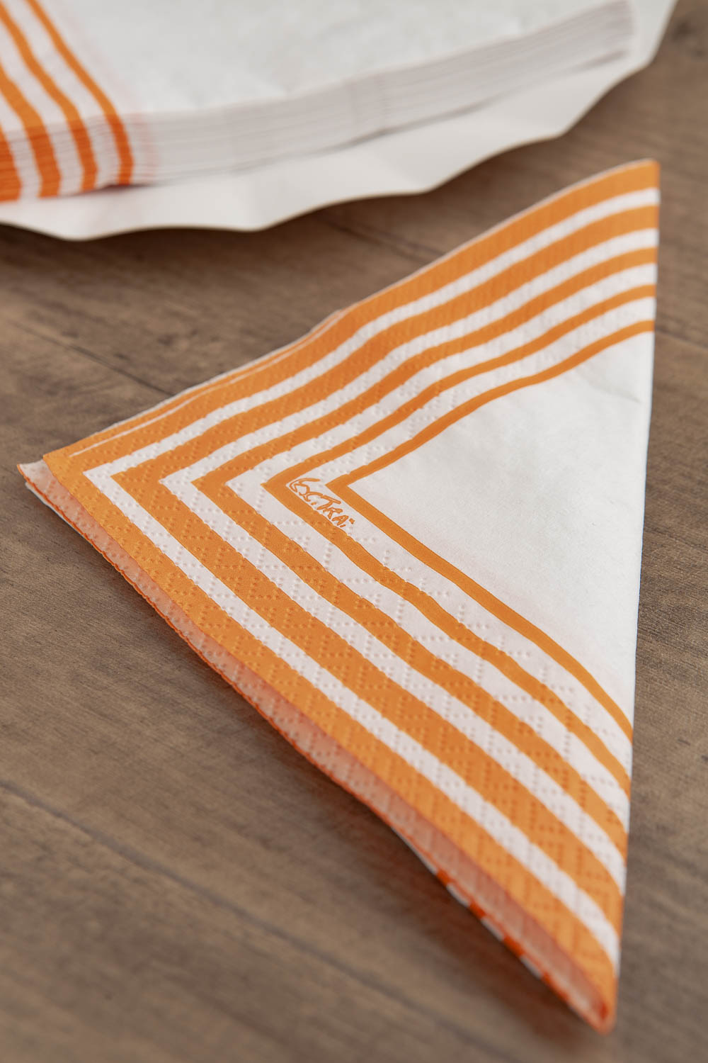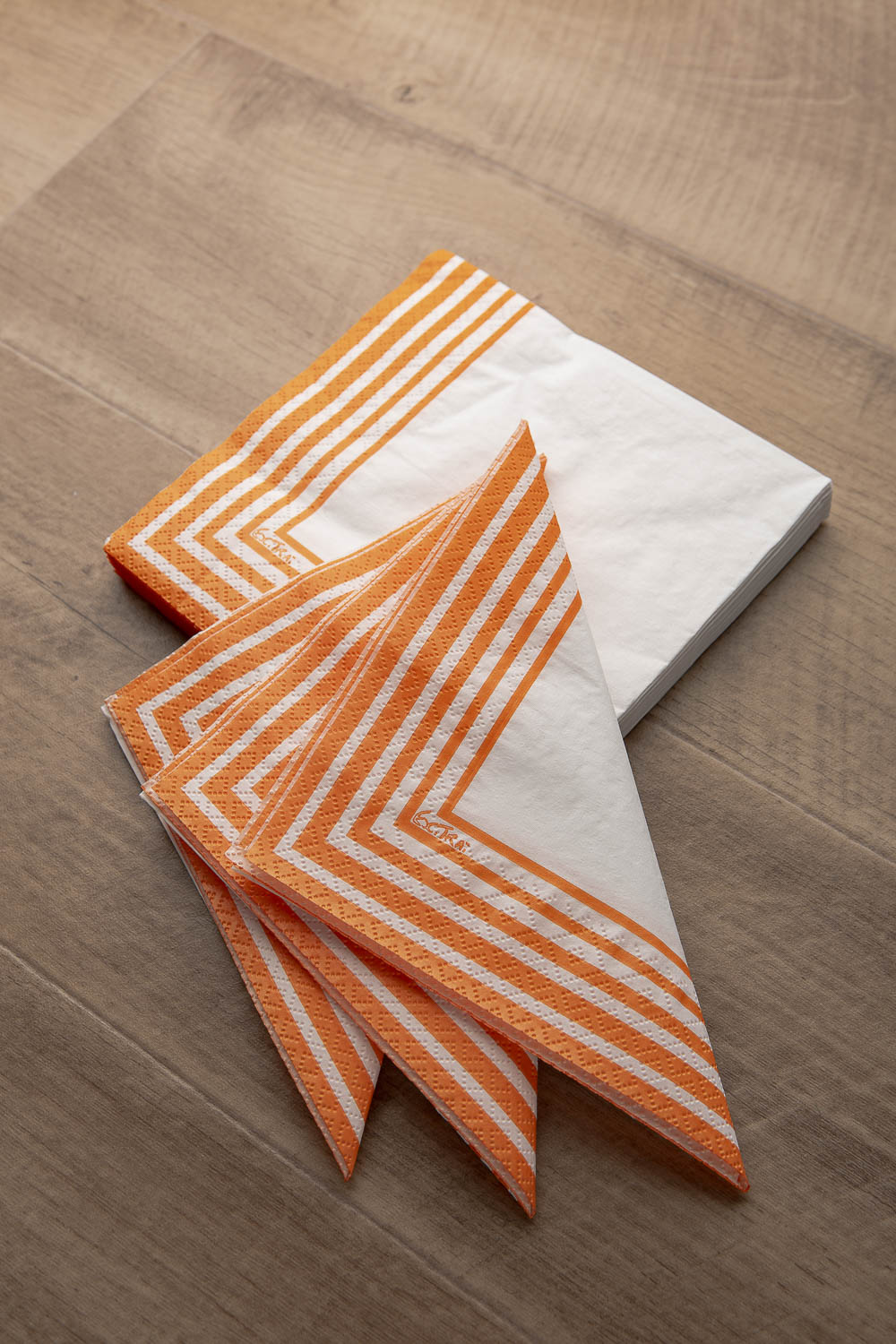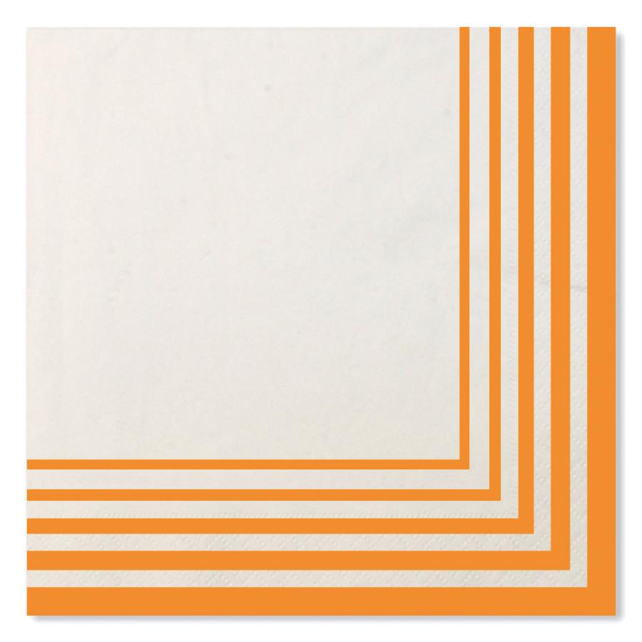 Tovagliolo in pura cellulosa compostabile 2 veli,33 x 33 cm, Made in EU, fondo bianco e righe colore arancio, Certificato OK COMPOST- TUV.